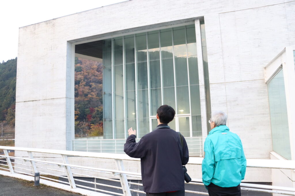 日吉町では、『日吉ダム』とその周辺施設を見学。建築家である團 紀彦氏が設計したダムのアーチ状の曲線に合わせた円形の建造物を見て回りました。貯水ダムとしての役割と温泉などのレジャー施設の役割を併せ持つ巨大な建造物に学生も興味津々でした。