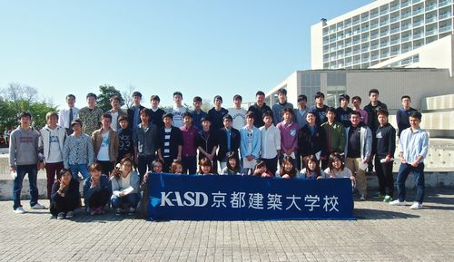建築家 安藤忠雄が設計した淡路夢舞台でクラスごとに集合写真。(写真は1年G組)