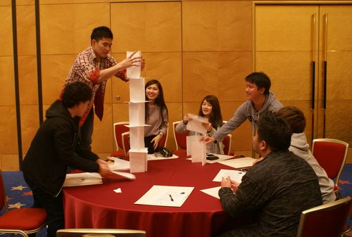 他のグループよりも高くペーパーを積み上げられるようにチームで協力し合います。