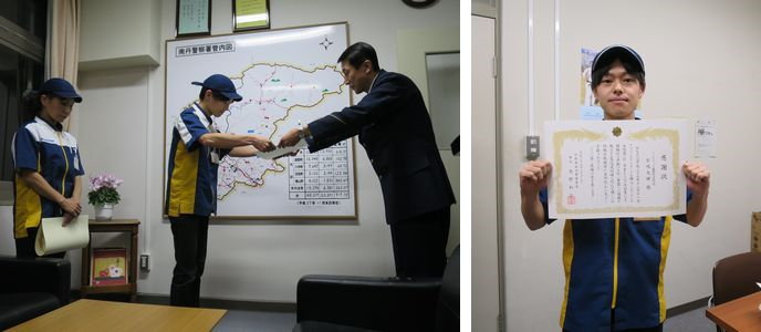 2年生の宮嶋大輝さんがアルバイト先のコンビニエンスストアで特殊詐欺を防いだとして、南丹警察署より感謝状を受けました。