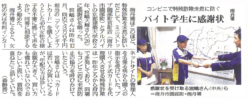 今回、宮嶋さんが防いだプリペイド式カードを代理購入させる特殊詐欺は京都府内でも多発しており、宮嶋さんが対応した客もカードを購入する様子が不慣れなことや、通常購入する年齢層の客とは違うことから不審に思い、警察署に相談するように勧めて詐欺を防止することができたとのこと。