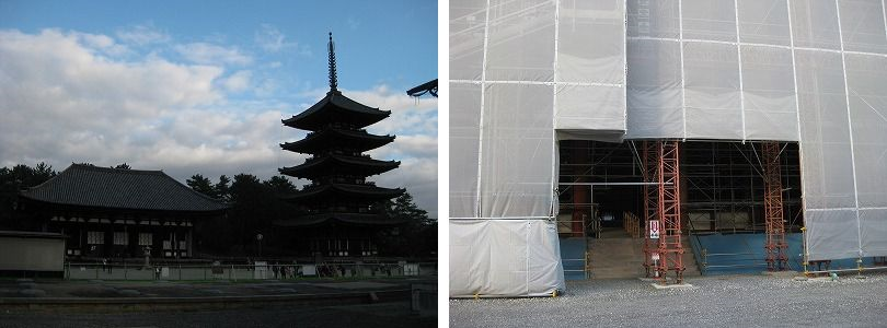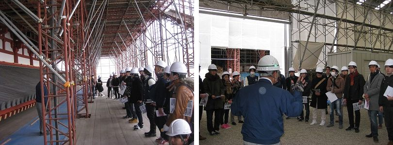 12月19日、建築学科3年生約50名が、和風建築見学研修で奈良市の「興福寺」の中金堂の復元工事現場を見学しました。工期は25年かかるとのこと。学生たちは工事を担当されている施工会社の方の説明を熱心にメモを取るなどした後、ヘルメットを着用し、現場へ案内して頂きました。