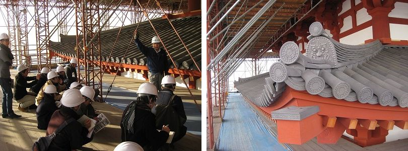 大きな屋根の鬼瓦が目の高さで見ることが出来るのが工事中の見学の貴重なところで、学生たちは普段は見れない実際の現場を見れて、より興味・関心が高くなりました。これらの経験が、来春からの就職活動の意識にも役立つことでしょう。