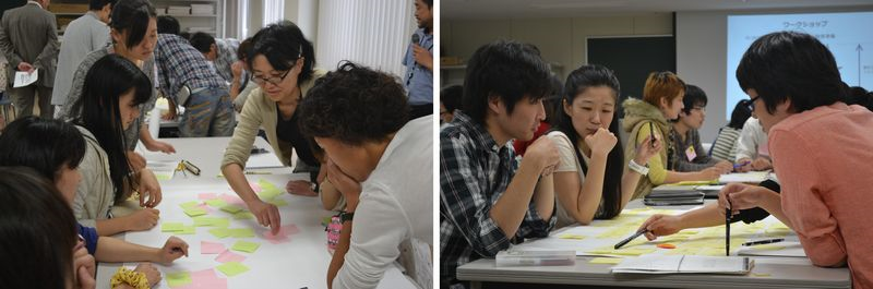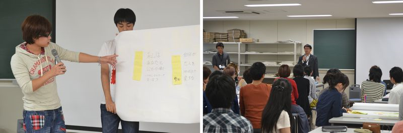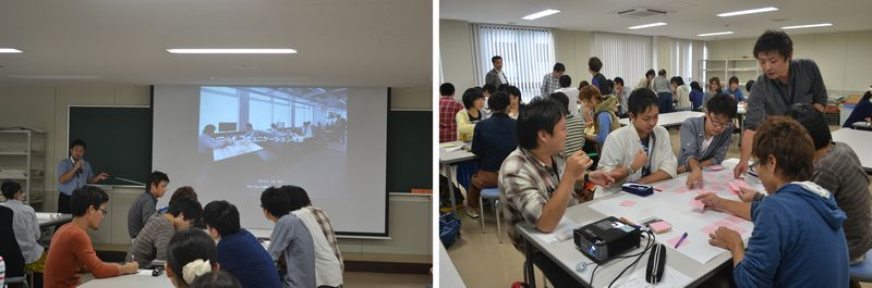 最初に、内田洋行様よりコミュニケーションスペースに関するレクチャーを受けた後、学生たちが10のグループに分かれディスカッションを開始。その後グループのメンバーを一部入れ替え再ディスカッション。最後にグループごとにコミュニケーションについてテーマを3つ上げて発表しました。