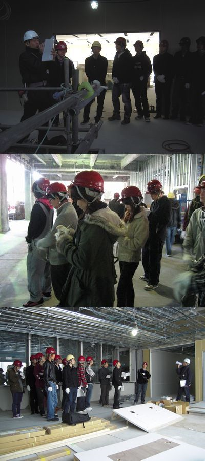 実際の現場を見学し、現場係員の方から工事概要や建設過程の説明を受けることで、「建築施工」の授業で学んだ内容をより深く理解することが目的です。