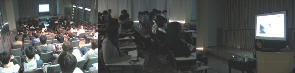 今回も建築部主催によるもので「建築によるエコロジー」—呼吸する皮膚のデザイン—と題し、先生がこれまで行ってこられたプロジェクトについてレクチャーされました。約100名が参加した今回のイブニングレクチャー。熱心にメモを取る学生や先生に質問する学生などもおり、よい刺激を受けている様子が伺えました。
