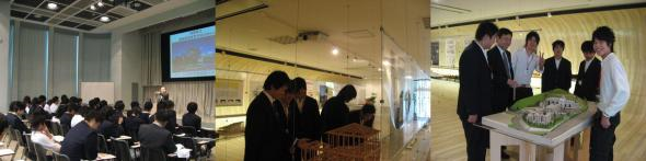 学校長・理事長より、本校の特徴や、建築業界の現状、資格の重要性や就職について等をお話させて頂いた後、校内見学を実施。京都建築大学校の施設や設備・授業風景と共に、併設校の京都伝統工芸大学校の実習風景もご覧頂きました。