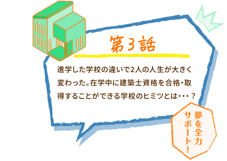 高校の同窓会で再会した鈴木君と山本君。二人とも同じ建築業界で働いているが鈴木君は仕事に悩み、山本君は成功を収めている。その違いは学生時代の建築士資格合格・取得にあった!京都建築大学校は建築士資格合格・取得、大学卒業資格、高度専門士を取得でき、さらに大学院進学も可能。そんな本校の魅力を動画で紹介!